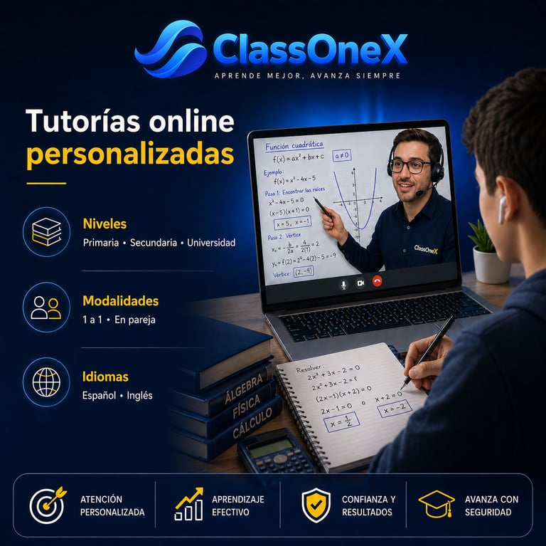 En ClassOneX ofrecemos tutorías online personalizadas para estudiantes de primaria, secundaria y universidad. Ayudamos a reforzar temas difíciles, prepararse para exámenes y mejorar la comprensión con clases claras, ordenadas y enfocadas en resultados.